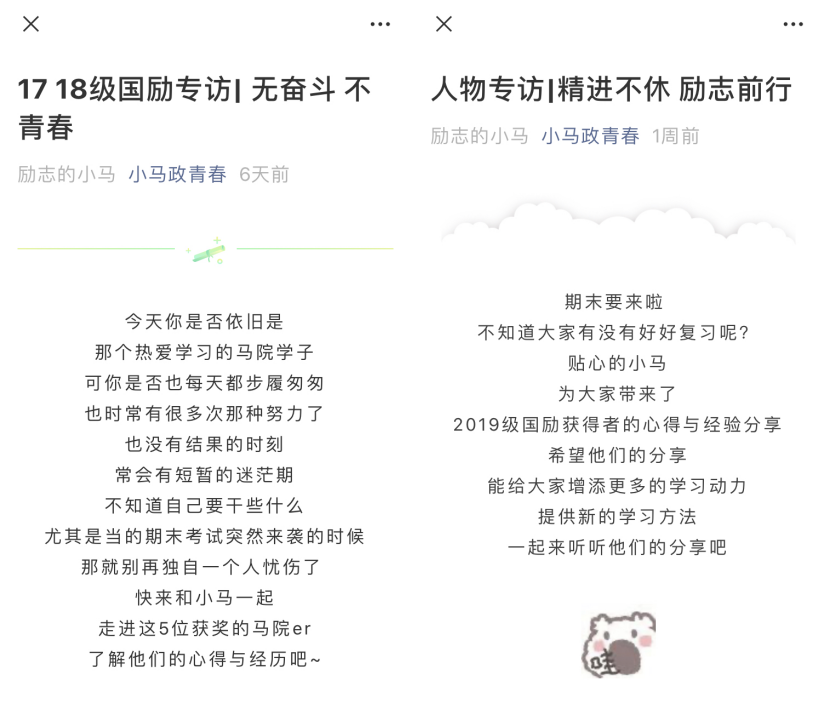 二是積極組織各項活動,為家庭經濟困難學生實踐鍛煉添磚加瓦。2020年上半年,我院開展資助育人文化節、“共抗疫情、愛國力行”系列活動,在資助育人文化節的子活動——“脫貧攻堅·誰的青春不奮斗”主題作品征集中,經過前期宣傳組織,我院一共征集文字作品34份、短視頻作品4份、圖片作品3份。在“共抗疫情、愛國力行”子活動——“戰疫有我”網絡文化作品征集活動,我院一共征集“國情小講堂”作品2份、短視頻作品2份、書畫作品1份、視覺設計類作品2份、網文作品5份。廣大受資助同學積極參與相關活動,這也是我院資助育人工作中厚植愛國情懷、鑄牢中華民族共同體意識的重要體現。同時,我院開展2021年寒假“愛在同城·攜手遠航”學生資助進鄉村達邊疆活動,受資助學生自發組建4支隊伍分別前往四川省涼山彝族自治州、貴州省銅仁市、重慶市黔江區、湖北省恩施市等邊疆民族地區,通過社會實踐活動,宣傳國家資助政策,為家鄉建設貢獻智慧力量。