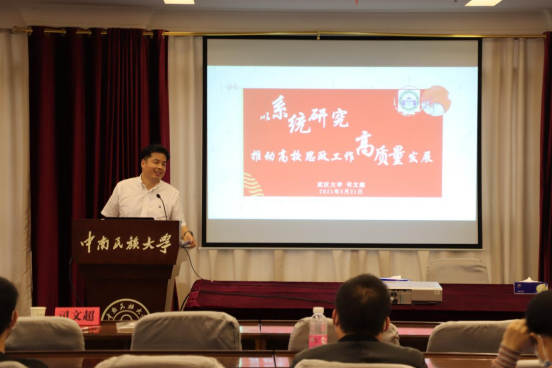 司文超從理論層面闡明了輔導(dǎo)員開展系統(tǒng)研究的重要意義,并提出輔導(dǎo)員要結(jié)合學(xué)生工作實(shí)際進(jìn)行多維多面的研究,無論是理論研究還是實(shí)踐研究都要更加服務(wù)于黨中央和教育部的決策參考,要更加關(guān)注師生的認(rèn)知規(guī)律和接受特點(diǎn),要更加精確提煉調(diào)查維度和核心指標(biāo),要更加注重選題的針對性和有效性;圍繞“認(rèn)清主流和基本面、從風(fēng)險和問題出發(fā)、把握譜系和晴雨表”三方面講解了如何更好把握當(dāng)代青年的思想動態(tài)、行為特點(diǎn)和工作重點(diǎn);從理論研究與實(shí)踐探索相結(jié)合的角度論述了新時代高校思想政治教育高質(zhì)量發(fā)展的內(nèi)涵要求、現(xiàn)實(shí)路徑和實(shí)踐理路,并以武漢大學(xué)研究生思想政治工作“鯤鵬提質(zhì)工程”為例,詳細(xì)講解了如何通過高質(zhì)量的理念、黨建、思政、管理、隊(duì)伍和實(shí)踐,系統(tǒng)謀劃“三全育人”的高質(zhì)量思想政治工作體系。結(jié)合工作體會,司文超最后向大家提出幾點(diǎn)建議:讀好書,有看家本領(lǐng);能帶隊(duì),有立項(xiàng)課題;多練筆,有得意之作;深耕植,有獨(dú)著大作;潛下心,有工作名片。
