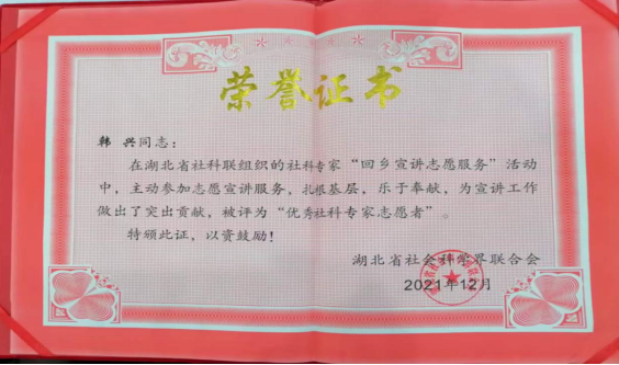 我院本科生韓興同學被湖北省社科聯授予“優秀社科專家志愿者”榮譽稱號