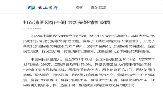 2022年中國(guó)網(wǎng)絡(luò)文明大會(huì)于8月28日至29日在天津成功舉辦。本屆大會(huì)以“弘揚(yáng)時(shí)代新風(fēng) 建設(shè)網(wǎng)絡(luò)文明”為主題,發(fā)布了《共建網(wǎng)絡(luò)文明天津宣言》,形成了新時(shí)代加強(qiáng)網(wǎng)絡(luò)文明建設(shè)的六個(gè)共識(shí)。落實(shí)大會(huì)共識(shí),加強(qiáng)網(wǎng)絡(luò)文明建設(shè),當(dāng)應(yīng)民之所想,行民之所盼,打造清朗網(wǎng)絡(luò)空間。這是新時(shí)代全體網(wǎng)民的共同責(zé)任。
