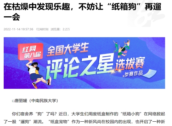 11月14日,我院思想政治教育專業20級本科生唐麗媛同學在湖南省主流媒體“紅網”上發表題為《在枯燥中發現樂趣,不妨讓“紙箱狗”再遛一會》的評論文章。唐麗媛同學是我院“南湖評論”團隊專業課程思政實踐育人平臺中的一員,該篇文章也入圍了紅網第八屆“全國大學生評論之星”選拔賽。這也是我院思想政治教育專業本科生在省級主流媒體發表的第三篇評論文章。
