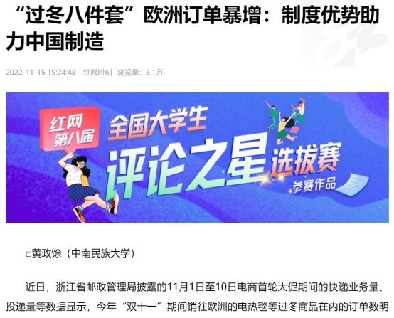 11月15日,我院思想政治教育專業2021級本科生黃政馀同學在湖南省主流媒體“紅網”上發表題為《“過冬八件套”歐洲訂單暴增:制度優勢助力中國制造》的評論文章。這是我院“南湖評論”團隊在省媒發表的第四篇文章。