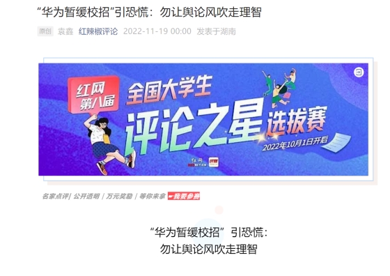 11月19日,我院思想政治教育專業20級本科生袁鑫同學在湖南省主流媒體“紅網”上發表題為《“華為暫緩校招”引恐慌:勿讓輿論風吹走理智》的評論文章。袁鑫同學是我院“南湖評論”團隊專業課程思政實踐育人平臺中的成員。這是我院思想政治教育專業本科生在省級主流媒體發表的第六篇評論文章,文章登上了紅網紅辣椒評論首頁,并被紅辣椒評論公眾號推送,進入了月賽。