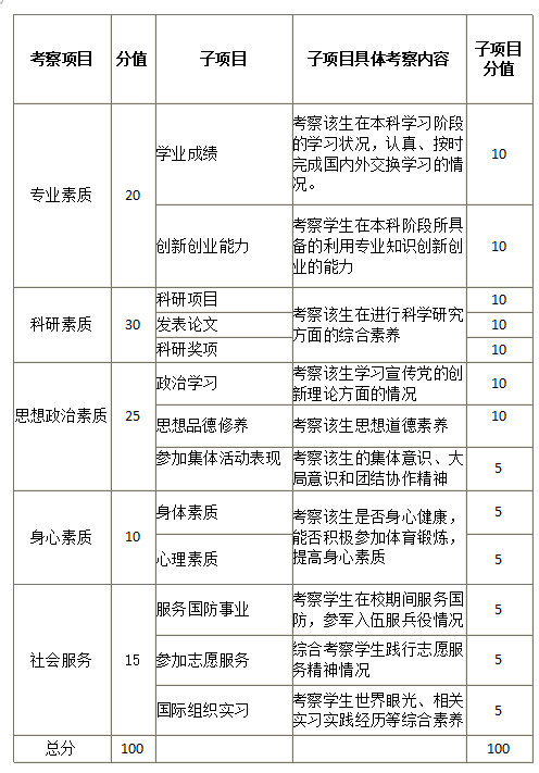(四)9月10日12:30-14:00學(xué)院組織綜合測(cè)評(píng)。綜合測(cè)評(píng)流程:申請(qǐng)人準(zhǔn)備5分鐘的陳述,可采用PPT演示,就專業(yè)素質(zhì)(包括專業(yè)基礎(chǔ)和創(chuàng)新創(chuàng)業(yè)能力)、科研素質(zhì)、政治思想素質(zhì)(包括政治學(xué)習(xí)、思想品德修養(yǎng)、參加集體活動(dòng)表現(xiàn)等)、身心素質(zhì)(包括身體素質(zhì)、心理素質(zhì))和社會(huì)服務(wù)(在校期間參軍入伍服兵役情況、參加志愿服務(wù)、到國(guó)際組織實(shí)習(xí)等情況)等五個(gè)環(huán)節(jié)進(jìn)行匯報(bào)和答辯,專家根據(jù)答辯情況打分。打分采用百分制。過(guò)程全程錄音錄像。