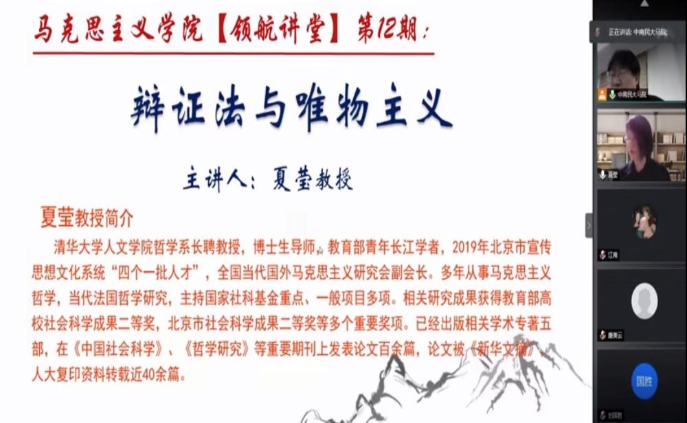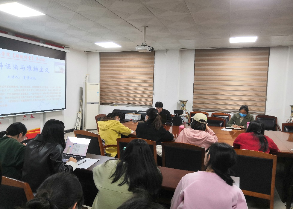 為開闊我院研究生學術視野,提高馬克思主義理論修養和水平,4月8日晚,馬克思主義學院“領航講堂”第十二講通過線上線下相結合的形式展開。清華大學人文學院哲學系長聘教師、博士生導師、教育部青年長江學者、全國當代國外馬克思主義研究會副會長夏瑩教授應邀為我院師生作題為“辯證法與唯物主義”的學術報告。本次講座由學院院長楊金洲主持,各教研室教師以及2019級、2020級研究生參加此次講座。