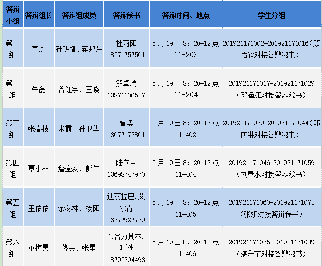 請各位老師和同學5月19號上午7:30到達各自的答辯地點做好答辯準備工作,答辯秘書于7:30到達1-401,領取畢業論文、答辯記錄等材料。具體分組等信息如下: