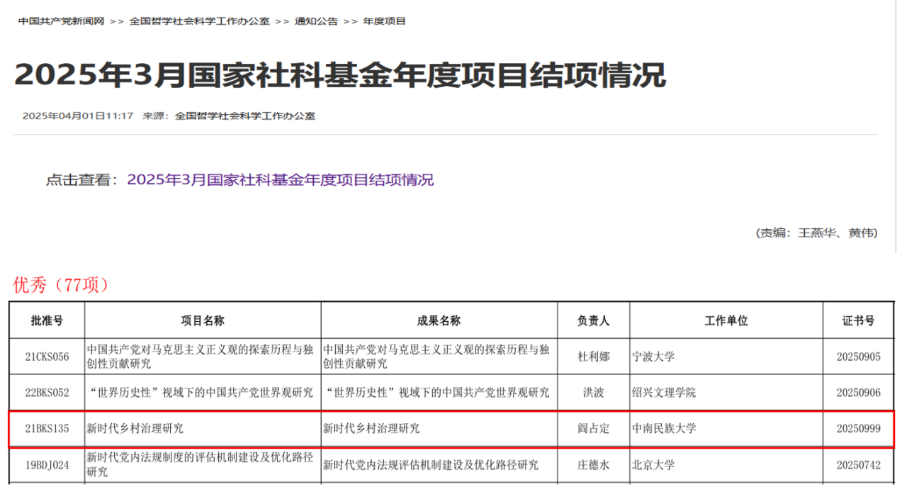 日前,全國哲學(xué)社會科學(xué)工作辦公室公布了2025年3月國家社科基金年度項目結(jié)項情況,我院閻占定教授主持的國家社科基金一般項目《新時代鄉(xiāng)村治理研究》(項目編號:21BKS135)成果被評定為“優(yōu)秀”等級。