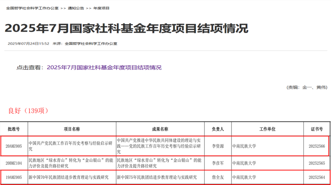 近日,全國哲學社會科學工作辦公室公布了2025年7月國家社科基金年度項目結項結果,我院李資源教授主持的國家社科基金重點項目《中國共產黨民族工作百年歷史考察與經驗啟示研究》(項目編號:20AMZ005)和詹全友教授主持的國家社科基金重點項目《新中國70年民族團結進步教育理論與實踐研究》(項目編號:19AMZ005)均以“良好”等級結項。