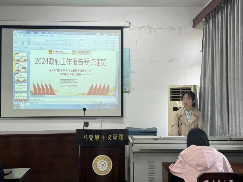 嚴亦心立足國務院政府工作報告,帶領大家一同學習了過去一年國家取得的各項成就和未來一年國家發展總體要求與政府的工作任務。她指出,作為思想政治教育專業學生,我們應該深入學習和領會政府工作報告精神,并將其融入日常學習生活中。