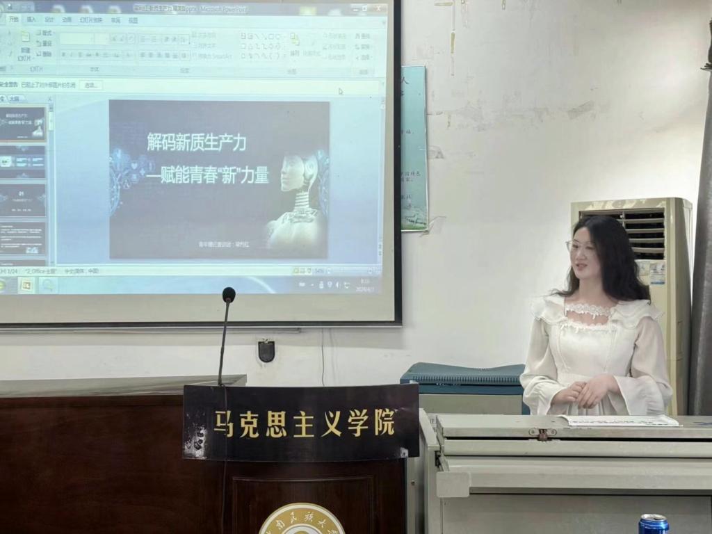 梁利紅圍繞政府工作報告中的熱點——新質生產力展開了宣講。她對新質生產力的發展歷史、內涵、定義、特征等進行了解讀,并將其與傳統生產力進行對比,生動闡述新質生產力的時代性與進步性。隨后,她從國家發展與個人生活兩個層面,對發展新質生產力的必要性與重要性進行了說明。梁利紅表示,國家應為新質生產力蓄勢賦能,從多方面入手;全社會多主體應共同努力,把握發展大趨勢;青年應不斷朝著高標準、高要求、高素質方向發展,為國家發展貢獻青春力量。