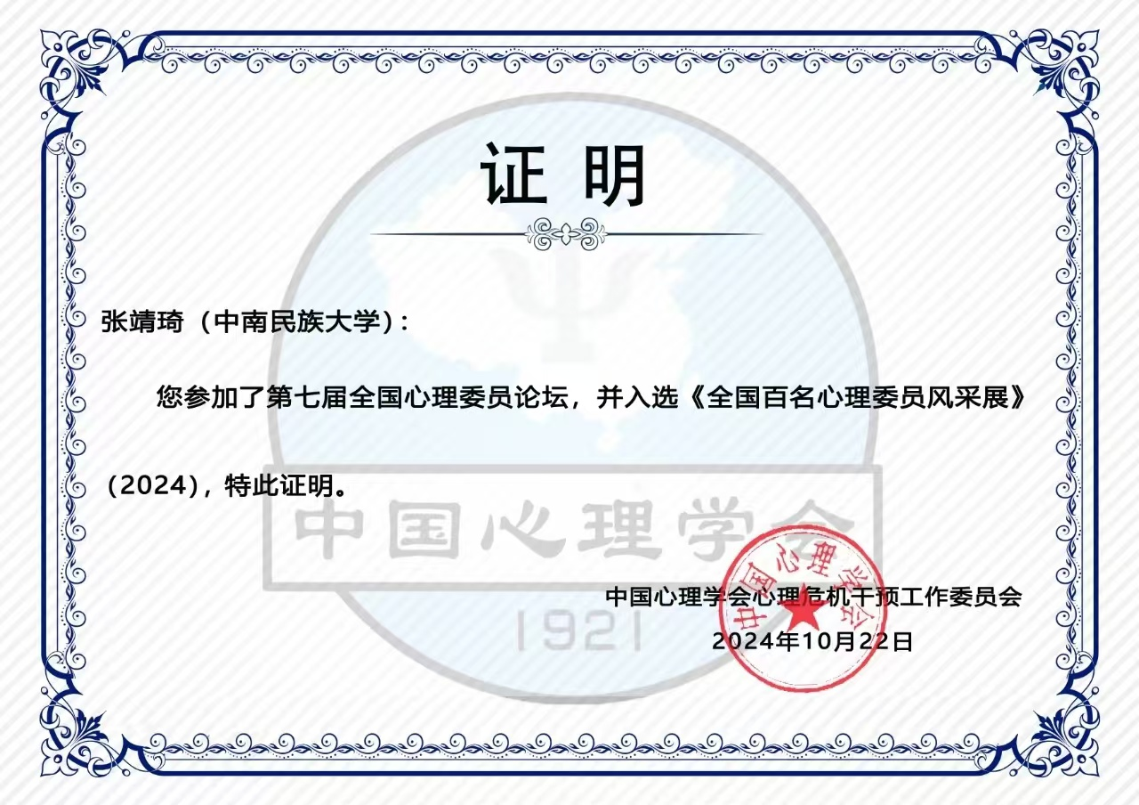 張靖琦在擔任心理委員期間,積極學習心理健康教育相關理論知識,推動心理健康工作日常化、制度化;配合學校學院開展系列心理健康主題活動,不斷提升自我,提高相關技能,取得心理委員MOOC培訓證書,并成功獲批了學工部2024年度心理健康校級項目。作為一名合格的心理委員,張靖琦牢記心理委員光榮職責與新時代青年神圣使命,強化理論學習,積極參加實踐,嚴格履職盡責,在我校舉辦的第四屆“十佳心理委員”評選中,她以第一名的評分脫穎而出,并代表學校參加了本次“全國百佳心理委員”論壇。