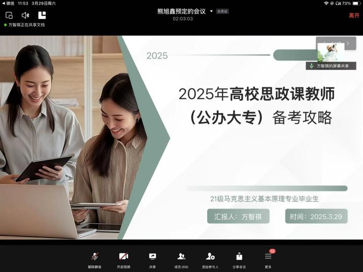 在經(jīng)驗分享環(huán)節(jié),六位優(yōu)秀畢業(yè)生結(jié)合自身經(jīng)歷,向同學們分享就業(yè)心得并提出建議。何靖珂分享了自己的申請讀博心得,強調(diào)學術(shù)興趣是深造的前提,并從聯(lián)系導師、準備材料、撰寫推薦信及收集資料四個方面作了詳細介紹。李玥佳分享了選調(diào)生備考體會,建議大家要首先明確職業(yè)定位,制定學習計劃,注重日常積累;要關(guān)注國情省情,主動把握機會,探索適合自己的道路。占燚和馬超現(xiàn)為黨校教師,詳細介紹了黨校招聘考試的特點。占燚提醒大家要注意本地與外地招聘政策差異,并推薦了高效收集信息渠道。馬超聚焦結(jié)構(gòu)化面試技巧,提出“理論+案例”的答題模式,并強調(diào)邏輯清晰、儀態(tài)大方是關(guān)鍵。方智祺現(xiàn)為高校思政課專任教師,結(jié)合自身經(jīng)歷,從報考條件、考試形式到備考策略,系統(tǒng)梳理了求職時間線,鼓勵大家“多嘗試、不氣餒”,保持積極心態(tài)。吳巧詩根據(jù)自己備考大學輔導員的經(jīng)歷,詳細分享備考的科學方法,她建議備考期間按題型分階段復(fù)習,通過反復(fù)練習與錯題分析提升應(yīng)試能力。與會同學表示“干貨滿滿,受益匪淺”。