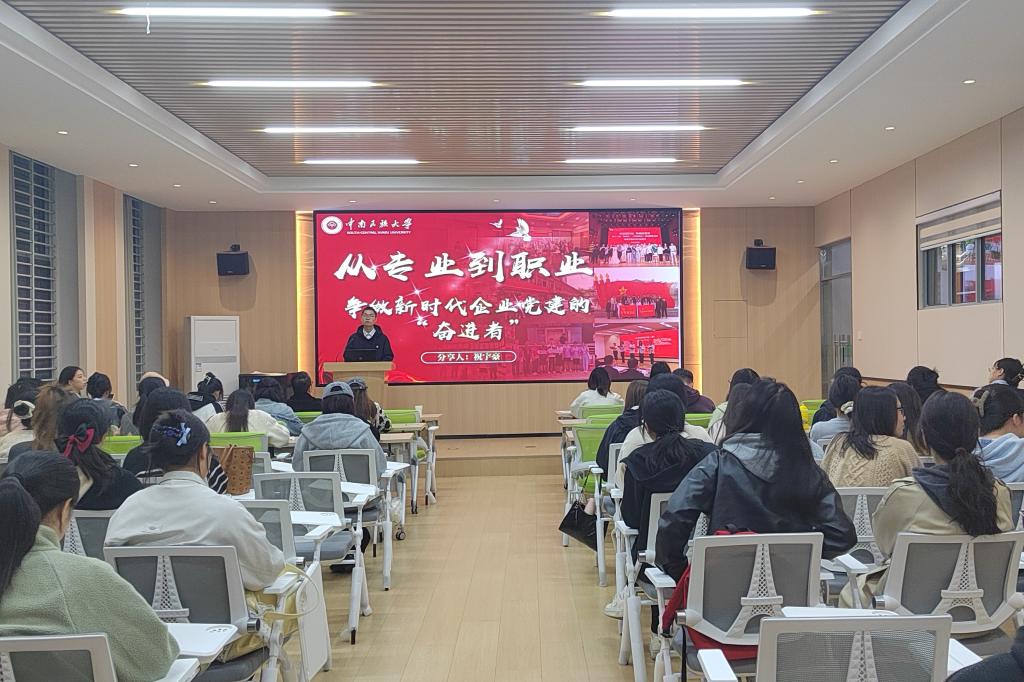報告中,祝宇豪回顧了自己在我院讀書學習時的經歷,重點介紹了振華重工的企業文化,并圍繞“如何成為新時代企業黨建奮進者”,結合自身經歷,從“識局、明志、精技、實戰”四個維度展開交流:一是“識局”,厘清央企國企區別與黨建工作重要性。他分享了習近平總書記關于國有企業黨的建設重要論述的學習體會,指出黨務崗位既是政治責任,也是復合型人才成長的快車道。二是“明志”,制定“戰略+戰術”雙層級成長路線。他建議研一時要勇于試錯,在科研、學生工作與競賽中定位自我;研二時要定向蓄力,盡早確定論文選題并積累可遷移能力;研三時要雙線推進,統籌論文寫作與求職準備,努力實現高質量畢業與就業。三是“精技”,錘煉“能說、能寫、能干”的硬核本領。他對照企業黨群、宣傳、人事等八大崗位模塊,拆解校園中可復制的訓練場景,鼓勵大家將每次學生工作歷練視為崗位預演,不斷提升實戰能力。四是“實戰”,把握“秋招+春招”雙線求職策略。他從網申技巧、簡歷撰寫、考公考編備考,到面試準備與崗前實習等全流程環節,提醒學弟學妹善于整合資源,實現高效求職。