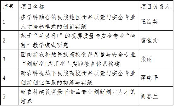 8月27日,教育部高等教育司公示了關(guān)于新農(nóng)科研究與改革實(shí)踐項(xiàng)目擬立項(xiàng)名單,擬對(duì)407個(gè)新農(nóng)科研究與改革實(shí)踐項(xiàng)目予以立項(xiàng)。我院承擔(dān)的5個(gè)項(xiàng)目主要研究方向是新型農(nóng)林人才培養(yǎng)改革實(shí)踐,主要以涉農(nóng)專業(yè)食品質(zhì)量與安全為依托平臺(tái)。