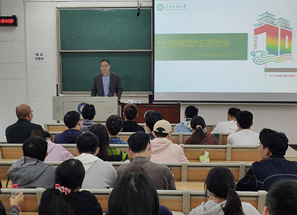 在學校70周年校慶來臨之際,校黨委副書記、副校長宋發軍于10月27日下午在11號教學樓210教室與生科學院學生座談交流,與同學們暢談校史校情,以及生科院院史,并了解同學們的學習、生活情況。學院黨委副書記楊征,班導師李曉華老師、程國軍老師,以及生物制藥專業2019級全體學生與會。