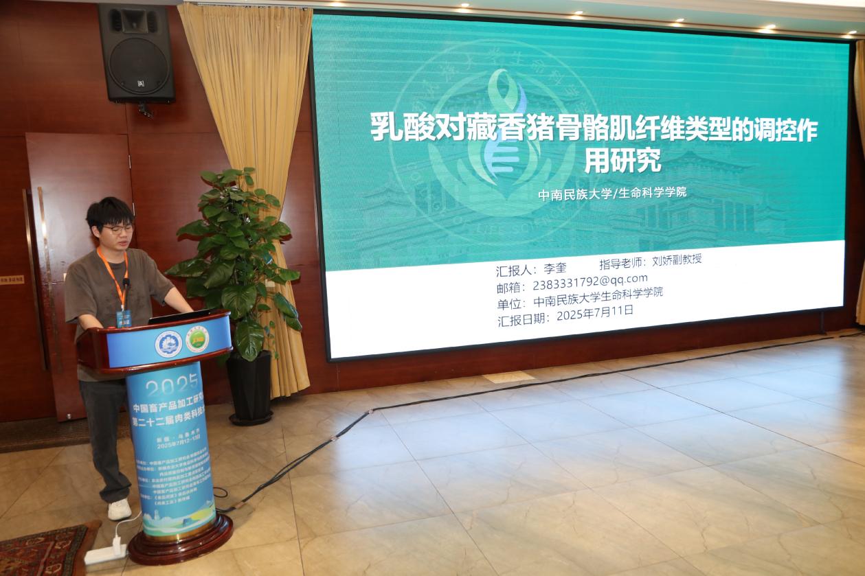 會議吸引了來自全國高校、科研院所及行業企業的專家學者參與,圍繞肉類加工新技術、品質調控、功能性肉制品開發、特色畜禽資源利用等熱點議題展開深入探討。中南民族大學生命科學學院特色生物資源保護與開發利用團隊的劉嬌副教授(碩士生導師)帶領碩士研究生李奎、張星雨參會交流。