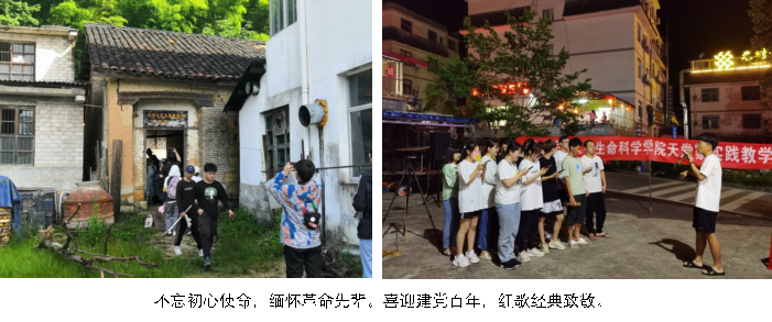 實習恰逢中國共產黨建黨100周年紀念,不忘初心使命,緬懷革命先輩,兩實習小分隊成立的臨時黨支部均開展多種形式的慶祝活動:吳家山實習師生組織參觀了劉鄧大軍天堂寨剿匪指揮部;天堂寨實習師生策劃組織了一場別開生面的“喜迎建黨百年,初心唱響紅歌”慶祝晚會。
