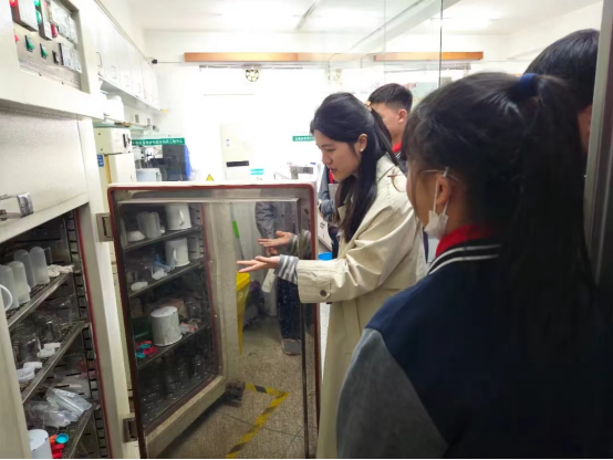 下午4時許,老師帶領同學們到達了生命科學學院4樓的實驗室,陳列在柜中的生物標本激起了他們的好奇心,使他們對接下來的參觀活動興趣十足。經過短暫的停頓整理后,同學們跟隨著實驗室志愿者,開始了此次參觀。