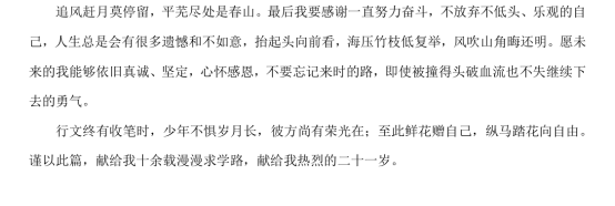 行文終有收筆時,少年不懼歲月長,彼方尚有榮光在;至此鮮花贈自己,縱馬踏花向自由。謹以此篇,獻給我十余載漫漫求學路,獻給我熱烈的二十一歲。