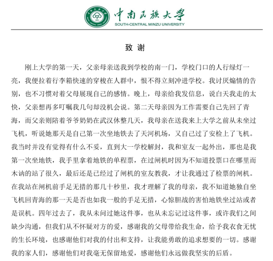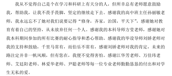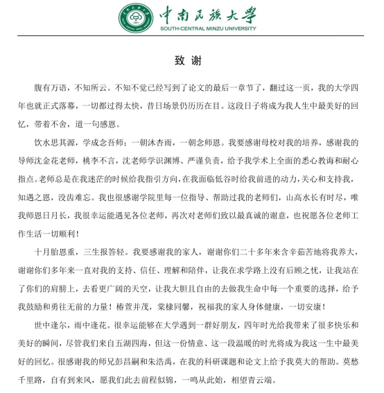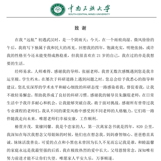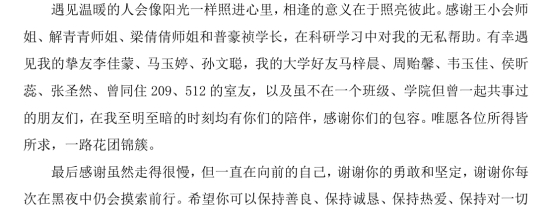 畢業在即,我再次衷心感謝在此過程中幫助過我的每個人,在今后的學習、工作和生活中,我會不忘親人的囑托,牢記師長的教誨,勇敢面對遇到的挫折和困難,繼續努力追求,不斷前行!最后祝愿大家都萬事順遂、喜樂安寧!
