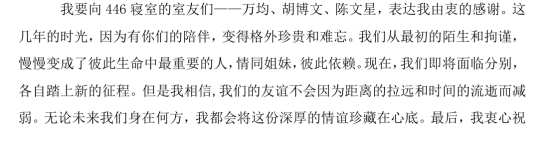 經過兩三個月的全力以赴,我的論文終于塵埃落定,這也意味著我即將告別這四年充實而難忘的大學生活,為它畫上圓滿的句號。回首這四年,從入學第一年的不知所措,到現在的成熟穩重。四年的時光悄然無息地溜走,這四年過得太快,我,在不知不覺中蛻變成了成熟穩重的自己,我們即將分別,但這四年將是我終身難忘的回憶。