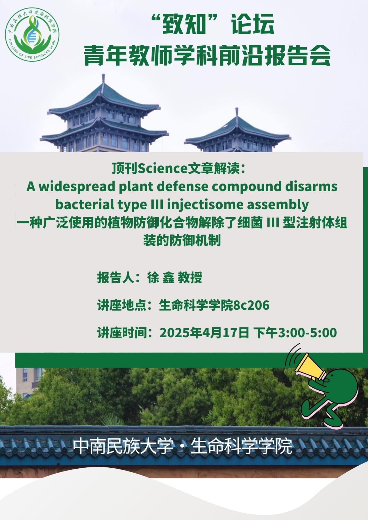 為進(jìn)一步濃郁科研氛圍,促進(jìn)學(xué)科交叉,激發(fā)創(chuàng)新靈感,為廣大師生提供一個思想碰撞的學(xué)術(shù)交流平臺,由中南民族大學(xué)生命科學(xué)學(xué)院主辦的“致知”論壇暨青年教師學(xué)科前沿報告會于2025年4月8日順利開展。本次沙龍由中南民族大學(xué)生命科學(xué)學(xué)院徐鑫教授做客分享,主題為”頂刊Science文章解讀:“A widespread plant defense compound disarmsbacterial type Ⅲ injectisome assembly”。
