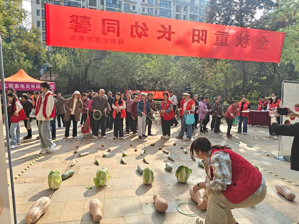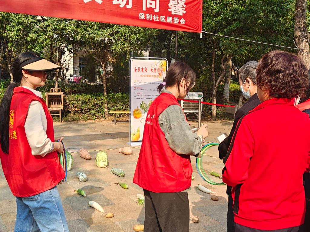 活動開展期間,志愿者們個個精神飽滿。有負責蔬菜套圈圈區(qū)的志愿者,志愿者提前把新鮮蔬菜擺成整齊的方陣,耐心指導老人調整姿勢。老年人們不斷投擲著手上的套圈,眼中滿是那“躺”在地上誘人的蔬菜。當圈穩(wěn)穩(wěn)套住青菜,志愿者立刻遞上“戰(zhàn)利品”,滿是重陽的溫情。
