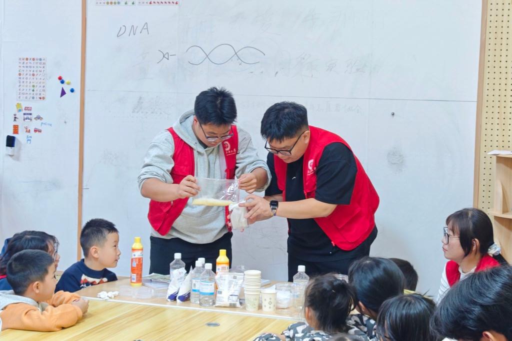 講解員同學(xué)舉著透明杯繞場(chǎng)展示:“大家看,這就是生命的‘絲線’,我們每個(gè)人身體里都有這樣的密碼哦!”演示環(huán)節(jié)結(jié)束后,在小朋友們的自主動(dòng)手實(shí)驗(yàn)環(huán)節(jié)里,志愿者們化身“一對(duì)一小導(dǎo)師”:手把手教他們把香蕉泥搗得更細(xì)膩,在倒酒精時(shí)輕聲提醒“要慢慢倒,像給小螞蟻搭小橋”。當(dāng)?shù)谝唤M小朋友成功挑出香蕉DNA時(shí),整個(gè)繪本館都沸騰了。紛紛將自己的實(shí)驗(yàn)成果展示給身邊的朋友以及志愿者哥哥姐姐們看,此時(shí),志愿者們心里也充滿著高興和自豪!