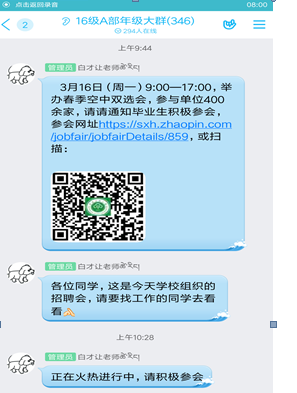 首先針對本次疫情期間的就業問題,白老師統計了管理學院A部300余名同學的就業意向以及就業情況,提出近期推出了空中雙選會以及“粵港澳大灣區”網上簽約培訓會,希望同學們應積極關注近期就業信息,做好網上簽約的準備工作,調整自身就業觀,堅持“先就業再擇業”,密切關注疫情期間國家的相關政策安排。針對2016級準備研究生復試的同學,應認真復習,積極準備復試,并及時與專業老師進行溝通交流,希望同學們可以取得好成績。針對2016級同學的學業學分問題,白老師提出有課的同學應積極上課,學分未修滿、學分未置換的同學應主動聯系學院教學秘書進行咨詢,同時應當進行創新創業學分相關資料的準備。針對疫情期間在國外的同學,學院也進行了溝通,切實了解了各位同學的身體健康狀況、學業情況以及就業情況。