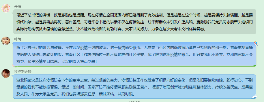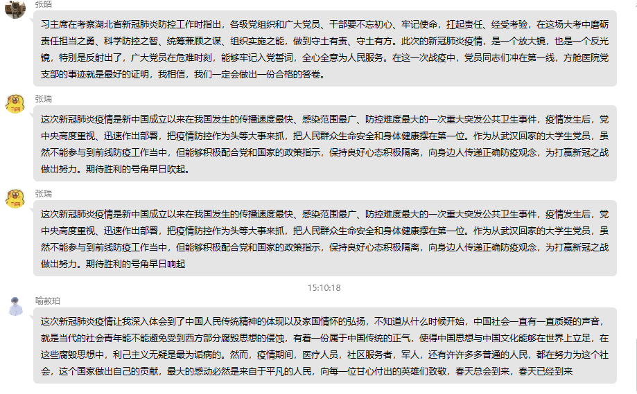 第一個(gè)部分,書記魯楠與疫情期間在家居家隔離和在線學(xué)習(xí)的黨員同志身體健康、學(xué)習(xí)狀況等表達(dá)了自身的慰問。