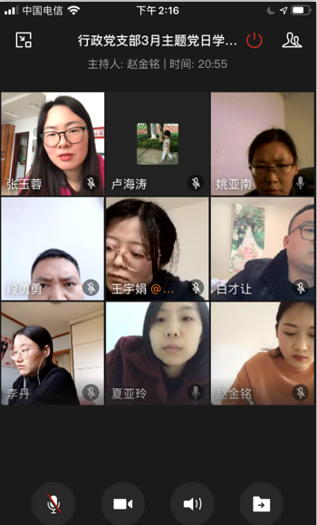 (文字作者:王宇娟)2020年3月23日下午14:00-16:00,管理學院行政黨支部積極響應黨委組織部下發的《關于開展2020年3月份黨支部主題黨日活動的通知》,以“大考之中踐初心,抗疫一線黨旗紅”為主題,在周一下午召開了3月份主題黨日活動,管理學院行政黨支部全體黨員參加此次線上會議,會議采用企業微信在線視頻會議的形式進行,黨支部書記張玉蓉同志主持此次會議。