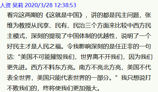 除了制度上的比較,許多同學都提到了在疫情面前,通過中西方采取的措施便足以看出民主模式的差距。趙軒同學說:“疫情當下,習近平總書記深入基層、慰問百姓與美國領導人推卸責任、不顧民生的不同態度不僅反映了領導人選舉的民主方式,更反映了兩國民主制度的天壤之別。”正如陸興海同學所說:“最好的,最代表人民利益的、最民主的還是中國特色社會主義下的民主模式。”