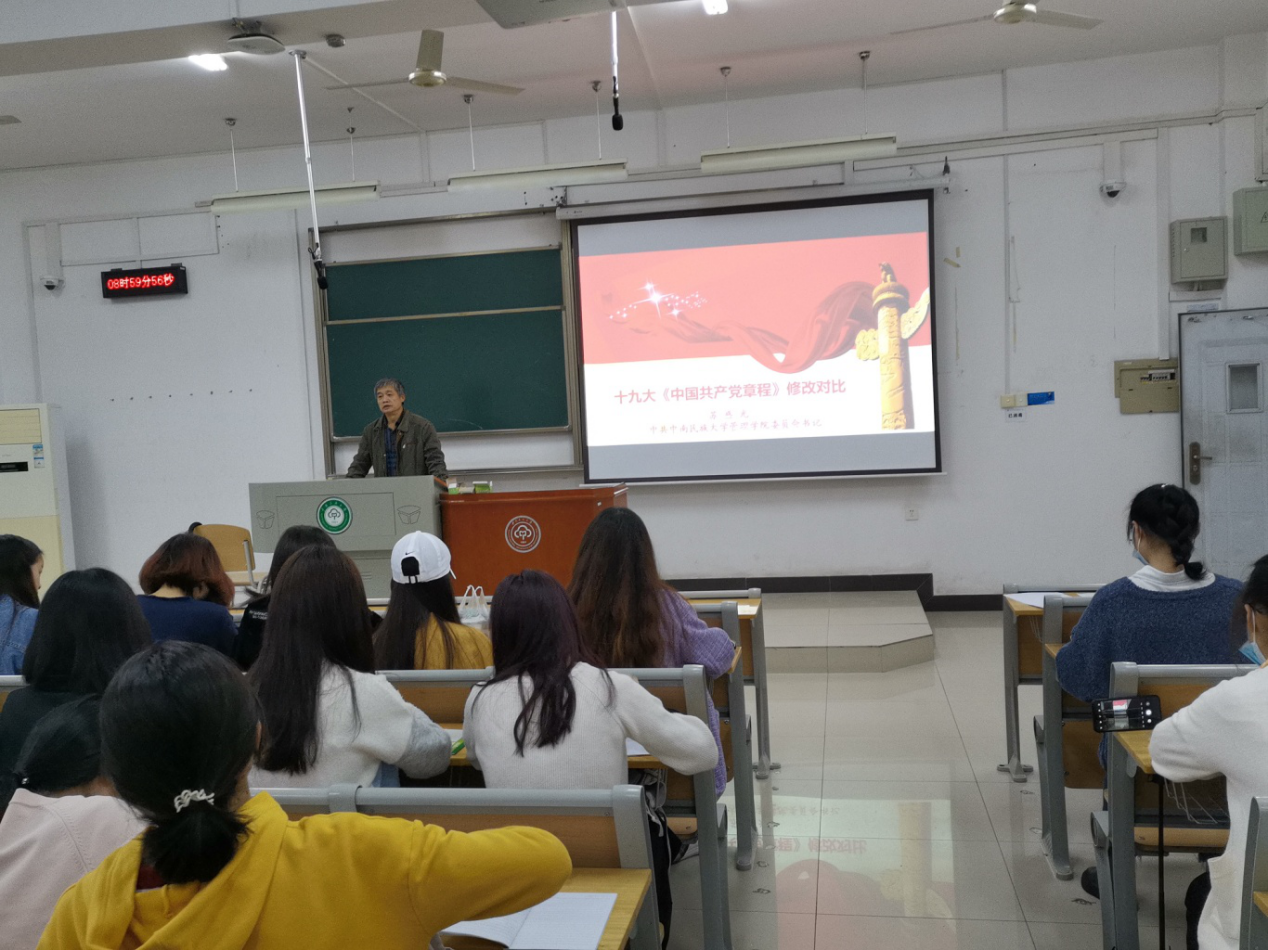 11月1日上午,入黨積極分子培訓(xùn)班由管理學(xué)院黨委書記蘇盛光老師以學(xué)習(xí)十九大《中國共產(chǎn)黨章程》為題展開本節(jié)課的內(nèi)容。蘇盛光同志講到:黨的十九大通過的黨章修正案,將習(xí)近平新時代中國特色社會主義思想,中國特色社會主義文化,實現(xiàn)中華民族偉大復(fù)興的中國夢,推進(jìn)國家治理體系和治理能力現(xiàn)代化,供給側(cè)結(jié)構(gòu)性改革,“綠水青山就是金山銀山”,人類命運(yùn)共同體,“一帶一路”,全面從嚴(yán)治黨,四個意識寫入黨章,黨章根據(jù)我國社會主要矛盾的轉(zhuǎn)化作出相應(yīng)修改。在新世紀(jì)新時代,經(jīng)濟(jì)和社會發(fā)展的戰(zhàn)略目標(biāo)是到建黨一百年時,全面建成小康生活;到新中國成立一百年時,全面建成社會主義現(xiàn)代化強(qiáng)國。