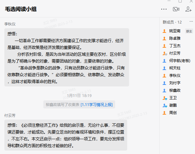 品讀紅色經(jīng)典,賡續(xù)紅色血脈。從寒假開(kāi)始,本科生第三黨支部發(fā)起持續(xù)一個(gè)月的紅色經(jīng)典閱讀活動(dòng)。活動(dòng)采取自愿原則,在《毛澤東選集》《習(xí)近平談治國(guó)理政》《共產(chǎn)黨宣言》三本經(jīng)典中自行選擇其中一本閱讀,共計(jì)12名黨員、48名發(fā)展對(duì)象、65名積極分子參與。
