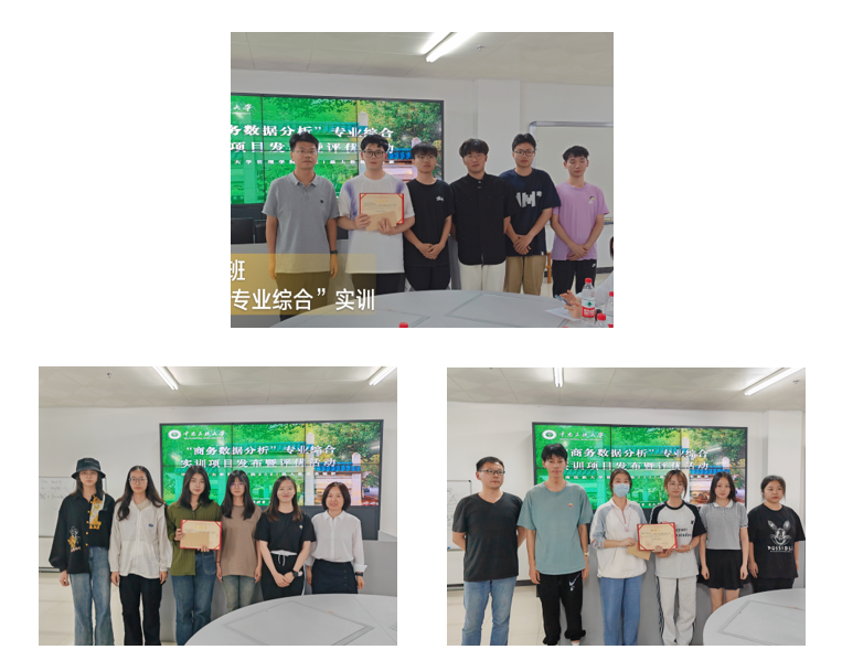 匯報會最后,公布了此次實訓評選出的三個“優秀項目團隊”,分別是:信源·圖譜(基于Bertopic和Neo4j圖計算的計算機領域文獻聚類與分析系統)、米事見(輿情分析平臺)以及光影(基于大數據的電影推薦平臺),由指導老師頒發獎勵;同時,也為每位同學頒發了此次實訓的結業證書。
