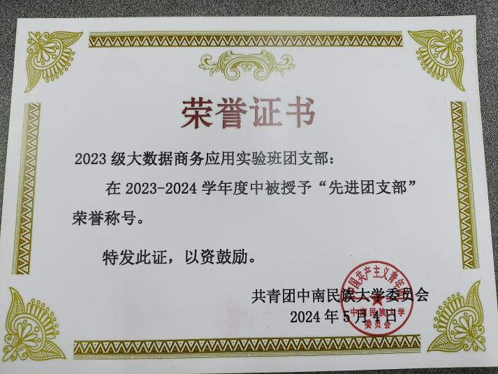 日前,在2023-2024年度中南民族大學共青團先進集體評選中,信管專業23級大數據實驗班榮獲“先進團支部”稱號。自班級成立以來,2023級大數據實驗班始終保持朝氣蓬勃、進取向上的優良作風,在信管教研室的引領和輔導員、班導師的指導下,全體同學共同努力,在思想建設、學風建設、實踐活動等方面都取得了不錯的成績。