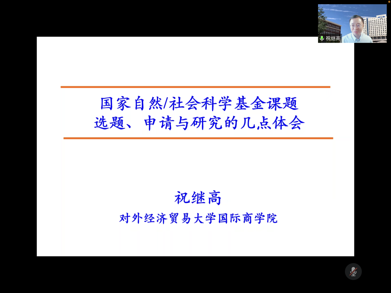 為加強我院師生對國家自然/社會科學基金課題選題、申請與研究的理解與學習,提高課題申報成功率,11月12日9:30,我院邀請到對外經(jīng)濟貿(mào)易大學國際商學院教授、博士生導師祝繼高以線上交流分享的形式開展《國家自然/社會科學基金課題選題、申請與研究的幾點體會》主題講座。此次講座由中南民族大學科學研究發(fā)展院、中南民族大學管理學院、中南民族大學民族地區(qū)數(shù)字化發(fā)展與治理研究中心、中南民族大學高校風險預(yù)警防控研究中心和教育部民族院校會計學專業(yè)虛擬教研室聯(lián)合舉辦。管理學院教師及研究生共100余人參加了本次講座,講座由院長張勁松主持。