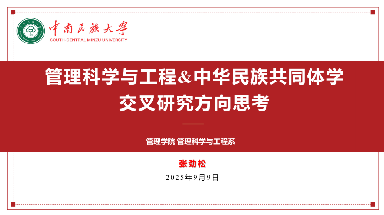(文字:何東辰)近日,管理學院管理科學與工程系圍繞“管理科學與工程&中華民族共同體學交叉研究方向”這一主題開展研討與交流,旨在充分發揮管理科學與工程的學科優勢,實現管理科學與工程和中華民族共同體學兩個學科在理論與方法層面的深度融合,為管工學科發展建設注入新的活力。管理科學與工程系張勁松老師做《管理科學與工程&中華民族共同體學交叉研究方向思考》主題分享,管工系全體教師參加。