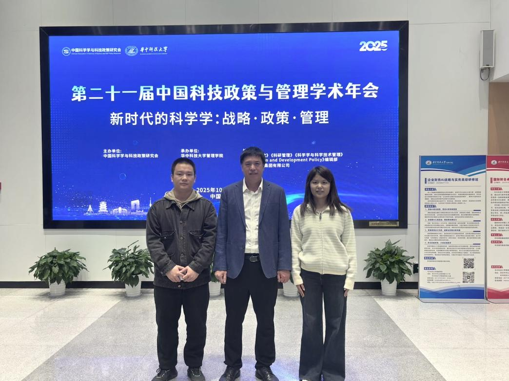 2025年10月24-26日,備受矚目的第二十一屆中國科技政策與管理學術年會在華中科技大學隆重舉行。本次會議匯聚了國內外該領域的頂尖學者與科研新銳,共同最新研究進展與發展趨勢。我院潘澤江教授和研究生王林順、完世琪應邀出席本次學術盛會,潘澤江教授作為特邀嘉賓做大會報告,同時擔任分會場評議人,展現了我校在該領域的學術影響力與活力。