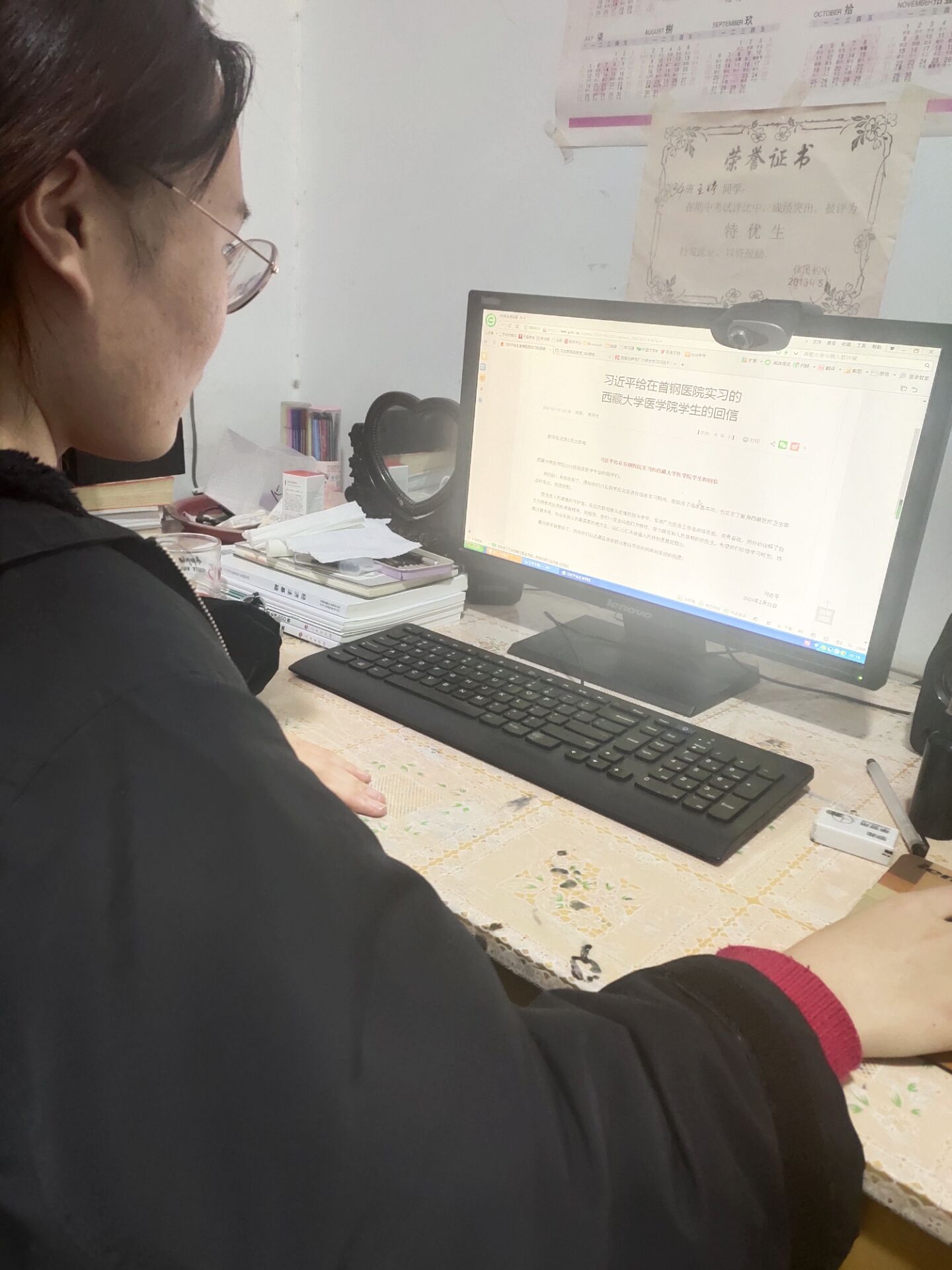 每個部門首先通過線上QQ視頻等多種方式進行主持開場,介紹了2020年初西藏大學17名臨床醫學本科生給習近平總書記寫信的簡要內容,并通讀了新華社于2月23日全文轉載的重要回信內容,說明了習近平總書記回信在專業、地域和時間上的特殊性,希望大家能夠充分認識習近平總書記重要回信的深刻內涵和重大意義。然后每位部員通過自主學習的方式觀看視頻和鏈接。最后結合習近平總書記重要回信的部分內容,每位部員都發表了學習感悟。
