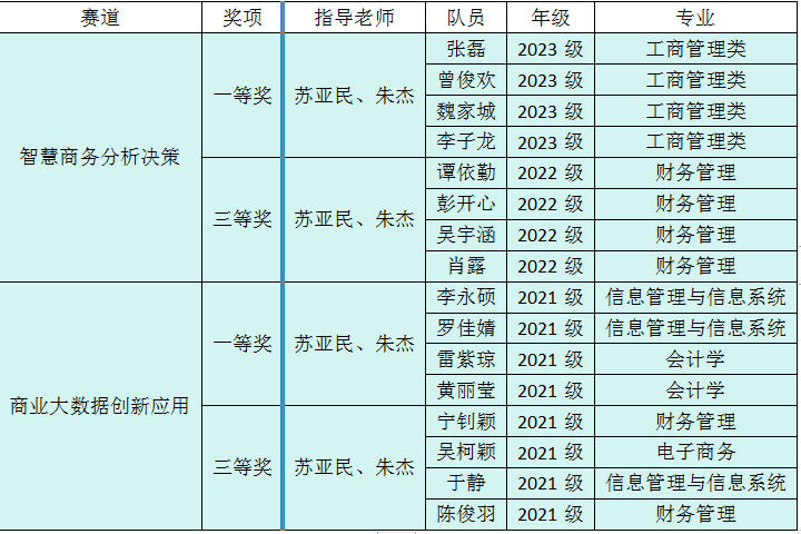 2024年4月,校內(nèi)選拔賽以信息技術(shù)水平考試的形式進(jìn)行,初賽理論考試內(nèi)容涵蓋了大數(shù)據(jù)基礎(chǔ)知識(shí)、商務(wù)智能、數(shù)據(jù)分析和處理等多個(gè)方面,旨在全面考察參賽選手的理論知識(shí)和實(shí)際應(yīng)用能力。2024年5月19日,區(qū)域選拔賽正式舉行,我校四支隊(duì)伍成功入圍全國(guó)總決賽。2024年6月1日,全國(guó)總決賽開賽,通過激烈的角逐,我院學(xué)子奪得全國(guó)一等獎(jiǎng)兩項(xiàng)、全國(guó)三等獎(jiǎng)兩項(xiàng)的佳績(jī),具體獲獎(jiǎng)情況如下: