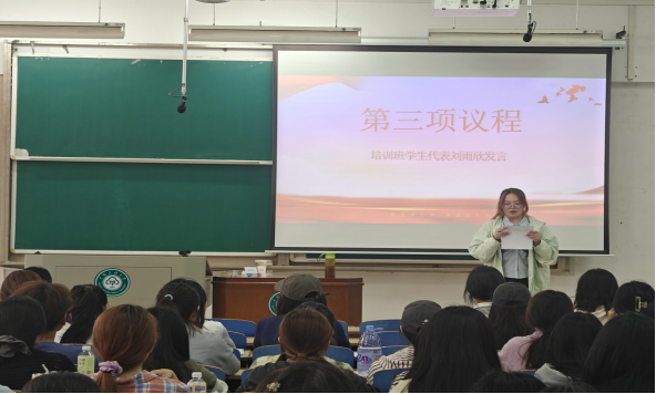 培訓班學員代表工商大類2405劉雨欣同學發言,她表達了向黨組織靠攏的堅定態度和決心,表示將珍惜此次培訓機會,努力學習黨的理論知識,提升自身思想覺悟,以實際行動踐行入黨初心,爭取早日成為一名合格的共產黨員。