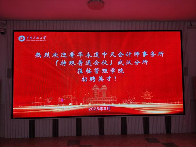 南湖秋水育棟梁,職場東風送良機。9月23日下午,普華永道中天會計師事務所(特殊普通合伙)武漢分所應邀在我院舉辦專場校園宣講會。宣講會由該所審計部經理林靖欽主持,我院優秀校友、現任職于該所的唐蛟、張智林返校分享。本次活動由我院會計系教師劉華統籌協助,為管院學子帶來了一場內容翔實的職業發展指導課。