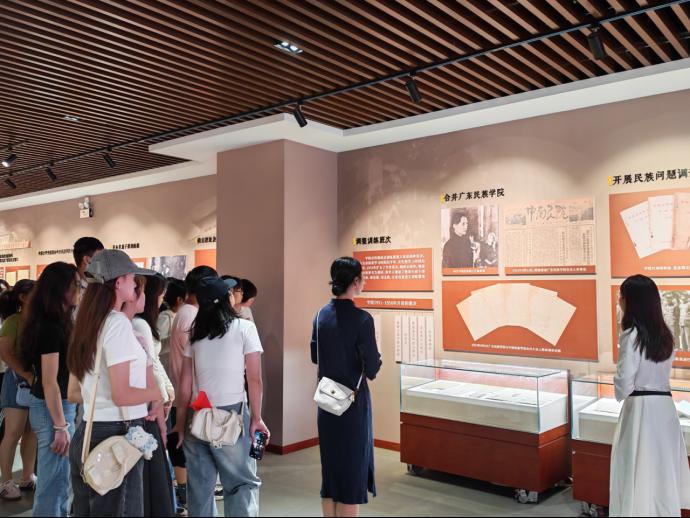 步入校史館,莊重的《校訓銘》鐫刻在石碑上,新生們紛紛駐足。在講解員帶領下,一幅跨越七十余載的發展畫卷徐徐展開。泛黃的老照片、珍貴的文獻資料、富有年代感的實物展品依次陳列,生動再現了中南民族大學自1951年建校以來的發展歷程。講解員從學校創建初期服務民族地區建設的實踐講起,詳細介紹了學校在不同歷史時期的辦學成就、學科建設突破、民族文化傳承成果及杰出校友事跡。