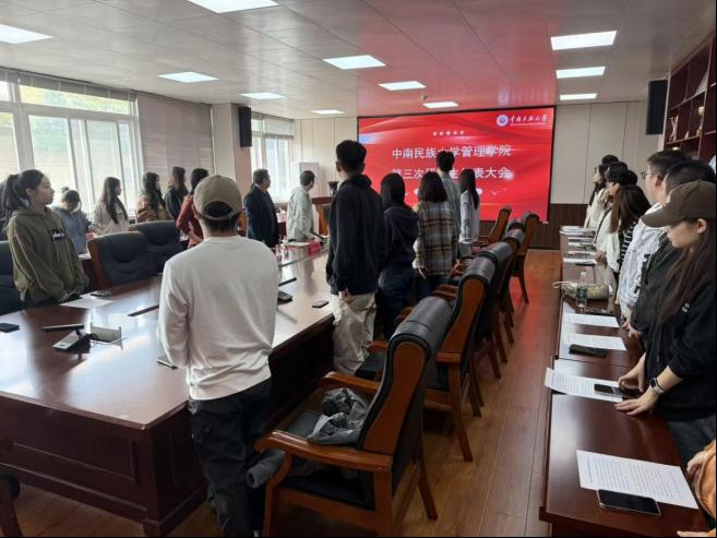 2025年10月27日上午11:50,中南民族大學(xué)管理學(xué)院第三次研究生代表大會(huì)在5棟206會(huì)議室隆重召開(kāi)。學(xué)院黨委副書(shū)記李明亮、學(xué)院學(xué)生工作辦公室負(fù)責(zé)人姚亞南、研究生輔導(dǎo)員羅震出席會(huì)議,研究生會(huì)主席團(tuán)候選人及24名研究生代表參加會(huì)議。會(huì)議由第三屆研究生會(huì)團(tuán)委副書(shū)記(學(xué)生)吳儀琳主持,旨在通過(guò)民主程序行使研究生民主權(quán)利、參與學(xué)院治理,核心議程為選舉產(chǎn)生新一屆研究生會(huì)主席團(tuán)成員。大會(huì)在莊嚴(yán)肅穆的國(guó)歌中拉開(kāi)序幕。