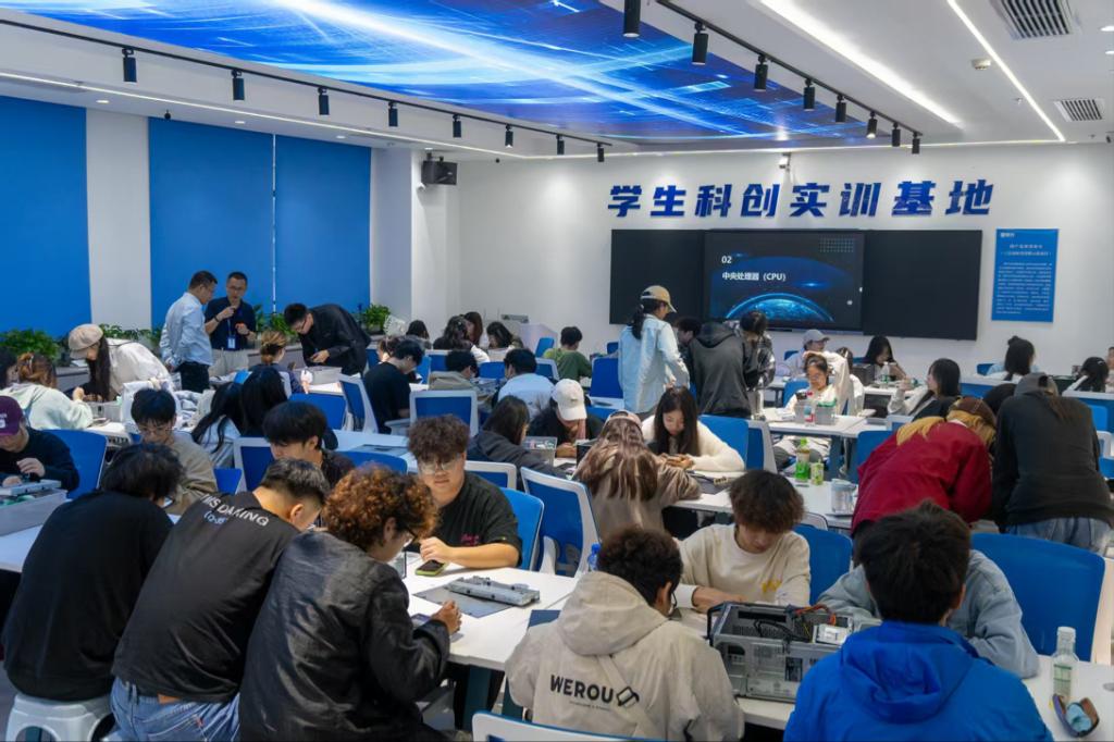 在科創實訓基地,負責人給同學們講解中國信創電腦的發展歷史,并介紹了芯片制造技術與星閃技術。同學們嘗試拆卸、安裝實驗主機,深入了解、主機構造。隨后師生參觀企業產線、見證一臺電腦的誕生,了解到攀升科技根據客戶訂單進行個性化生產,通過數字化看板實現實時生產可視化;提升機實現物料智能傳輸,智能倉儲系統實現從生產到物流的智能化。在星閃實驗室,同學們觀察芯片制造,體驗星閃技術,感受星閃鼠標與其他鼠標的差異,切實體會到國產技術的崛起。