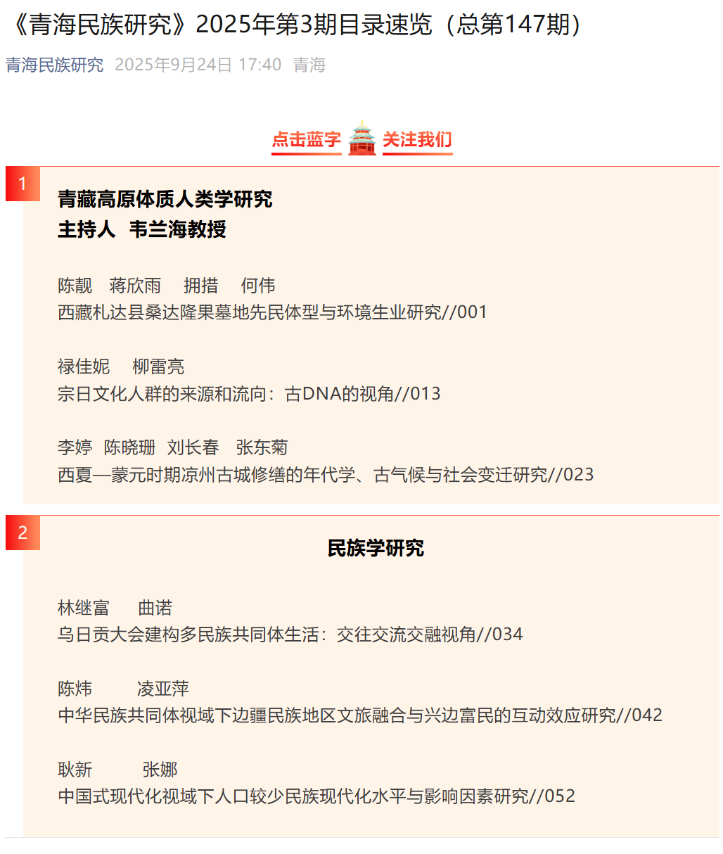 2025年9月24日,管理學院耿新教授作為第一作者撰寫的論文《中國式現代化視域下人口較少民族現代化水平與影響因素研究》在CSSCI期刊、北大中文核心期刊《青海民族研究》2025年第3期刊發,這是耿新教授主持的國家社會科學基金一般項目“人口較少民族同步實現人口現代化的測度與路徑研究”的階段性成果。