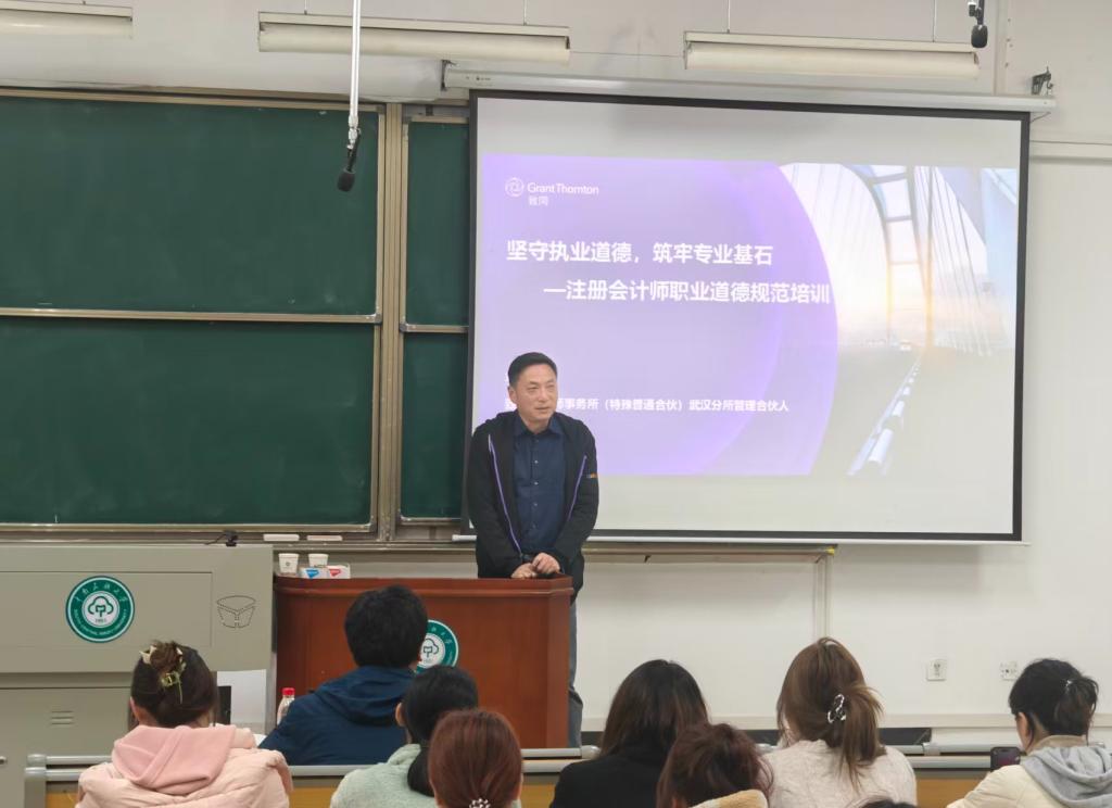 2025年11月22日,我院會計學系“會計職業前沿”系列講座迎來一場思想盛宴。致同會計師事務所(特殊普通合伙)武漢分所管理合伙人金鑫所長應邀蒞臨,為2024級會計學專業學生作了題為《注冊會計師職業道德規范》的專題報告。會計學系高娟、劉亞偉、馬彬彬老師一同出席活動。本次講座旨在引導學生從職業起點即筑牢倫理根基,深刻理解注冊會計師作為資本市場“看門人”的崇高責任與時代使命。
