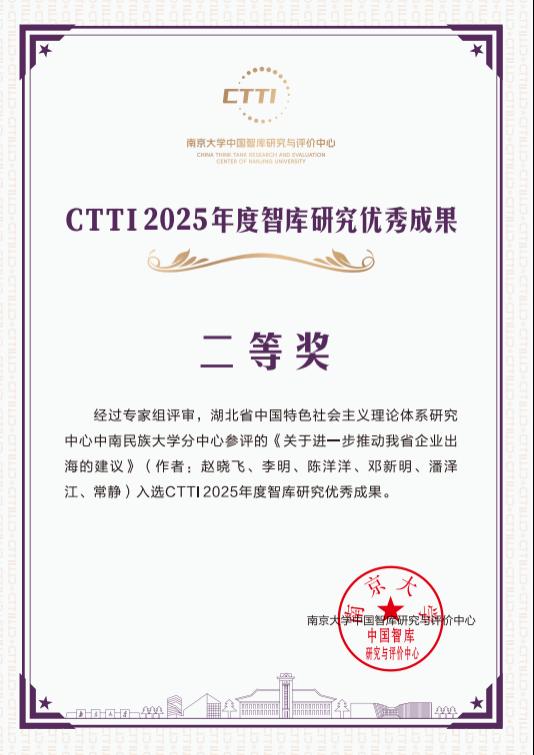 本次論壇發布了南京大學中國智庫研究與評價中心標識、南京大學中國智庫研究與評價中心十周年報告、《中國特色新型智庫建設理論與實踐探索(2015-2025)》以及政府數字服務能力指數報告。論壇最后公布了CTTI 2025年度智庫建設最佳案例和優秀研究成果的征集與推介結果以及CTTI 2025高校智庫百強榜。中南民族大學管理學院趙曉飛研究團隊代表中國特色社會主義理論體系研究中心中南民族大學分中心提交的咨政報告《關于進一步推動我省企業出海的建議》獲得CTTI2025年度智庫研究優秀成果二等獎。這是我院教師首次獲得CTTI年度智庫研究優秀成果,反映了我院在智庫研究方面的重要突破。