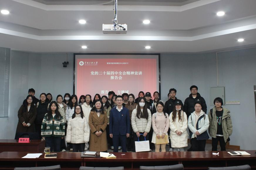 為深入學習貫徹黨的二十屆四中全會精神,堅定青年團員的理想信念,中南民族大學管理學院注會2501班于2025年12月9日上午開展12月主題班團會。本次團會以黨的二十屆四中全會為主要內容,邀請校黨委常委、副校長方德斌教授主講,學院黨委書記聞亮主持,管理學院院長、注會班班導師翟華云及全體學生參會。